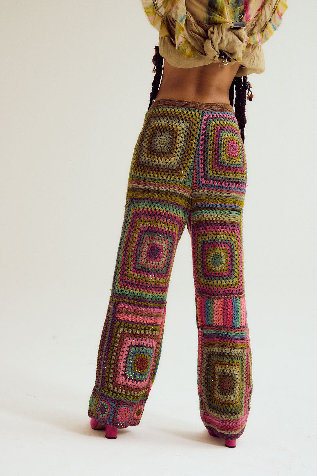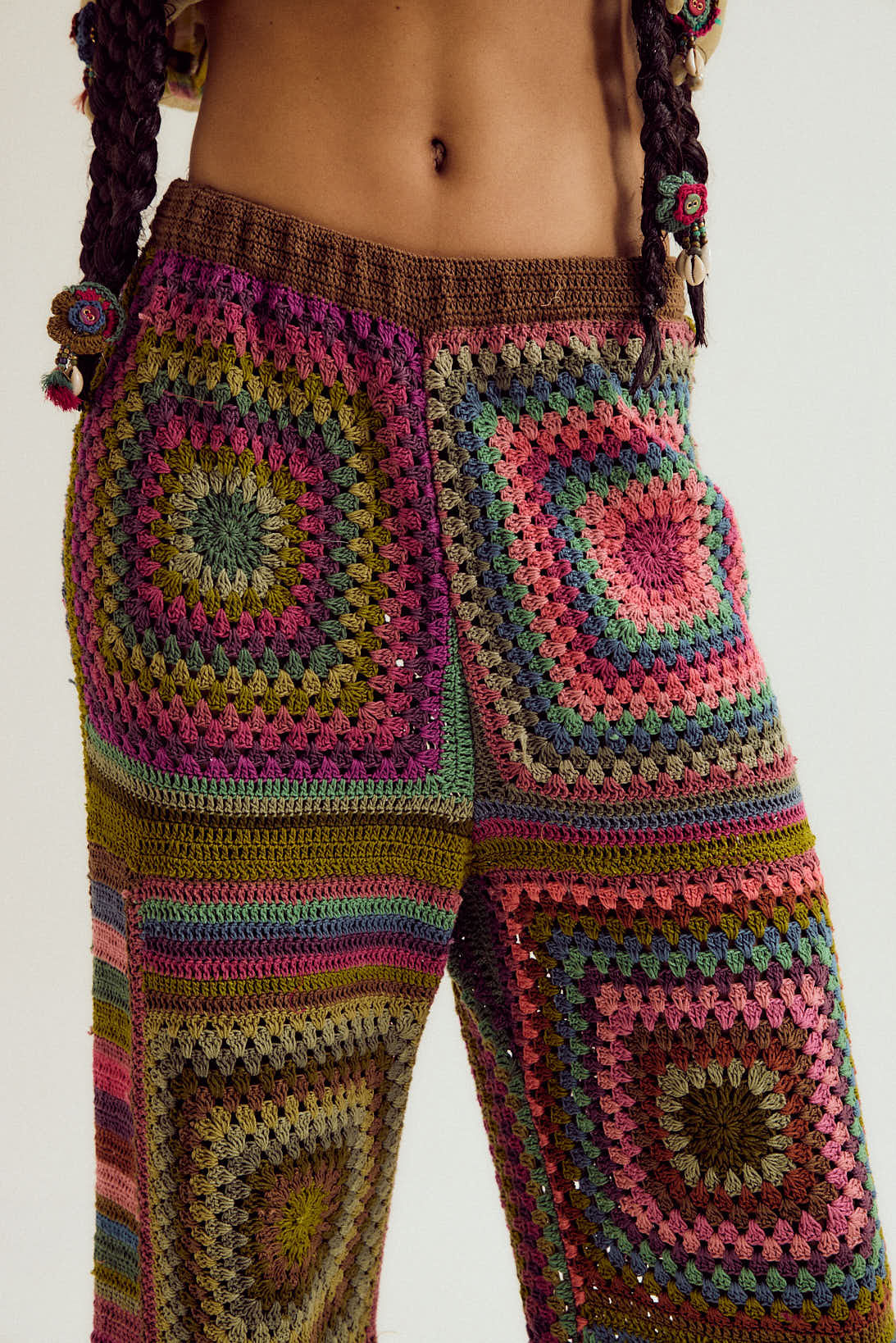 Hand-crocheted in multiple colours, these panelled pants feature an elasticated waist and a textured surface that adds depth while remaining easy and comfortable to wear.