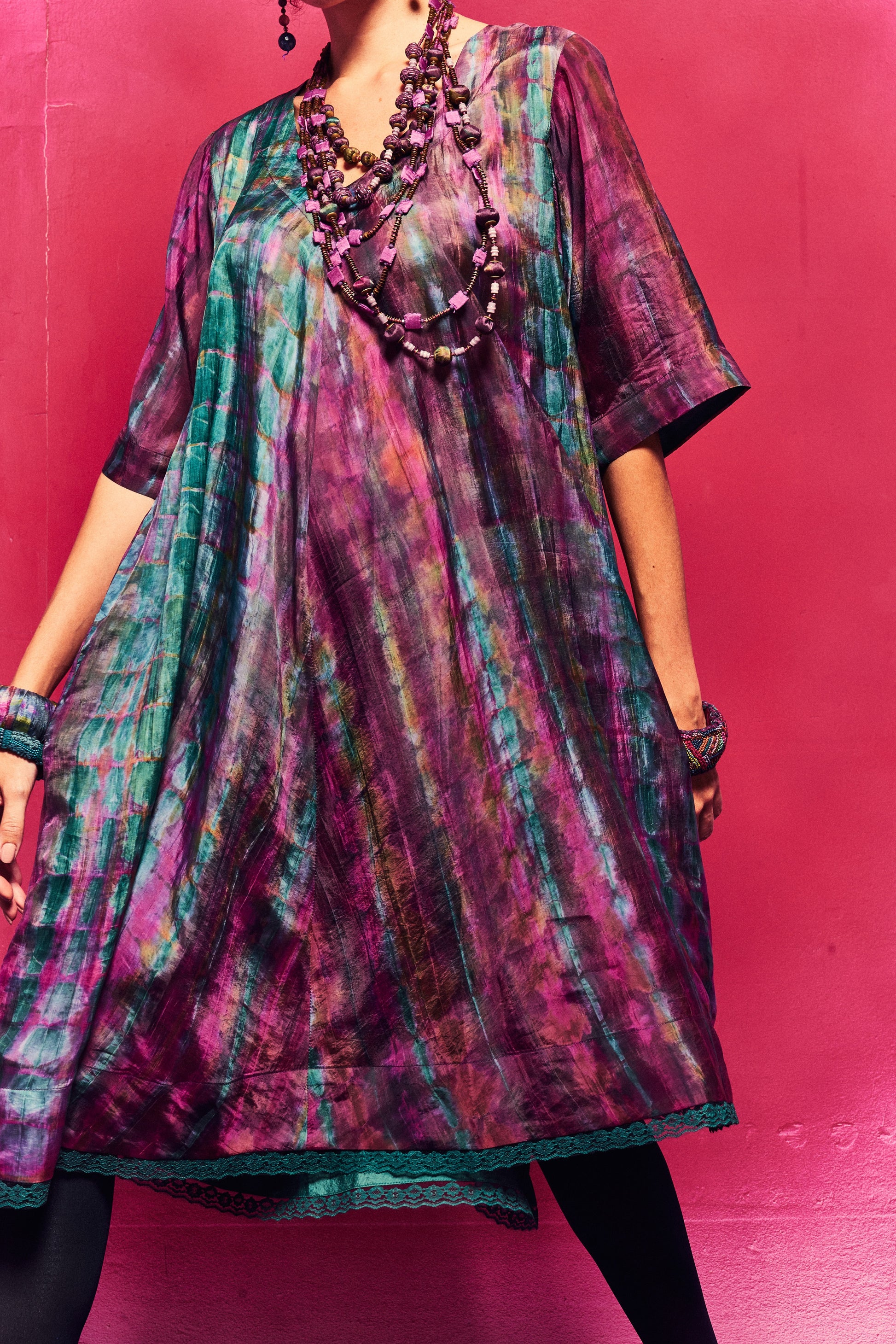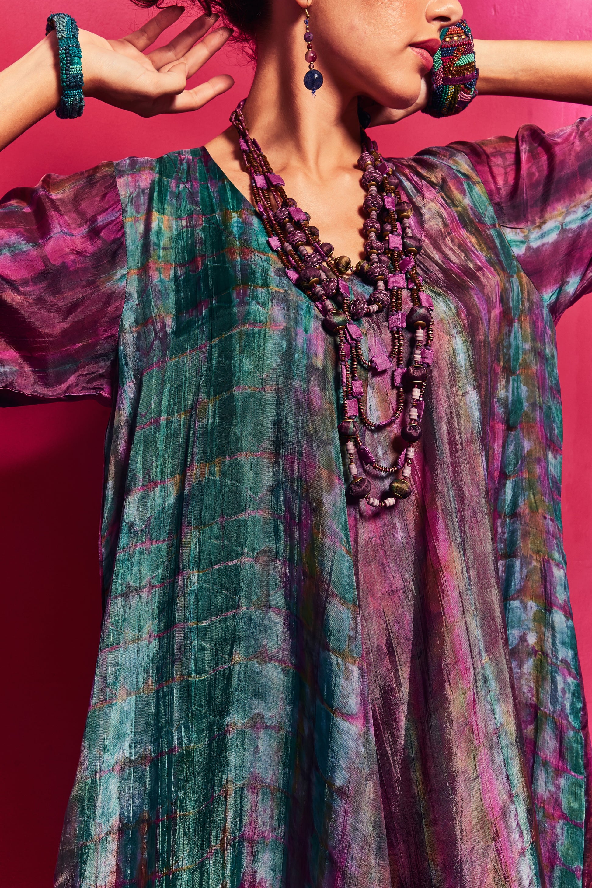 Kiara is a Bias-cut A-line silk tie-dye dress complemented with a handmade layered necklace. This versatile piece with gorgeous layered nacklace, is all you need for the perfect festive look.
