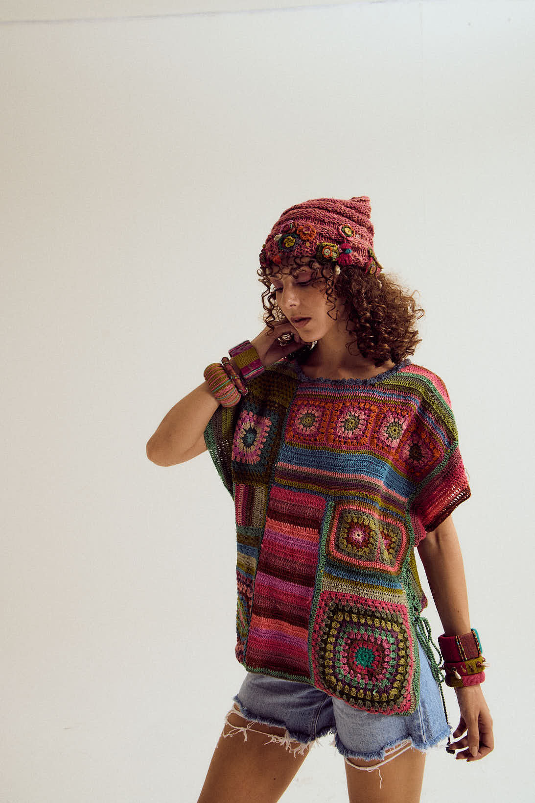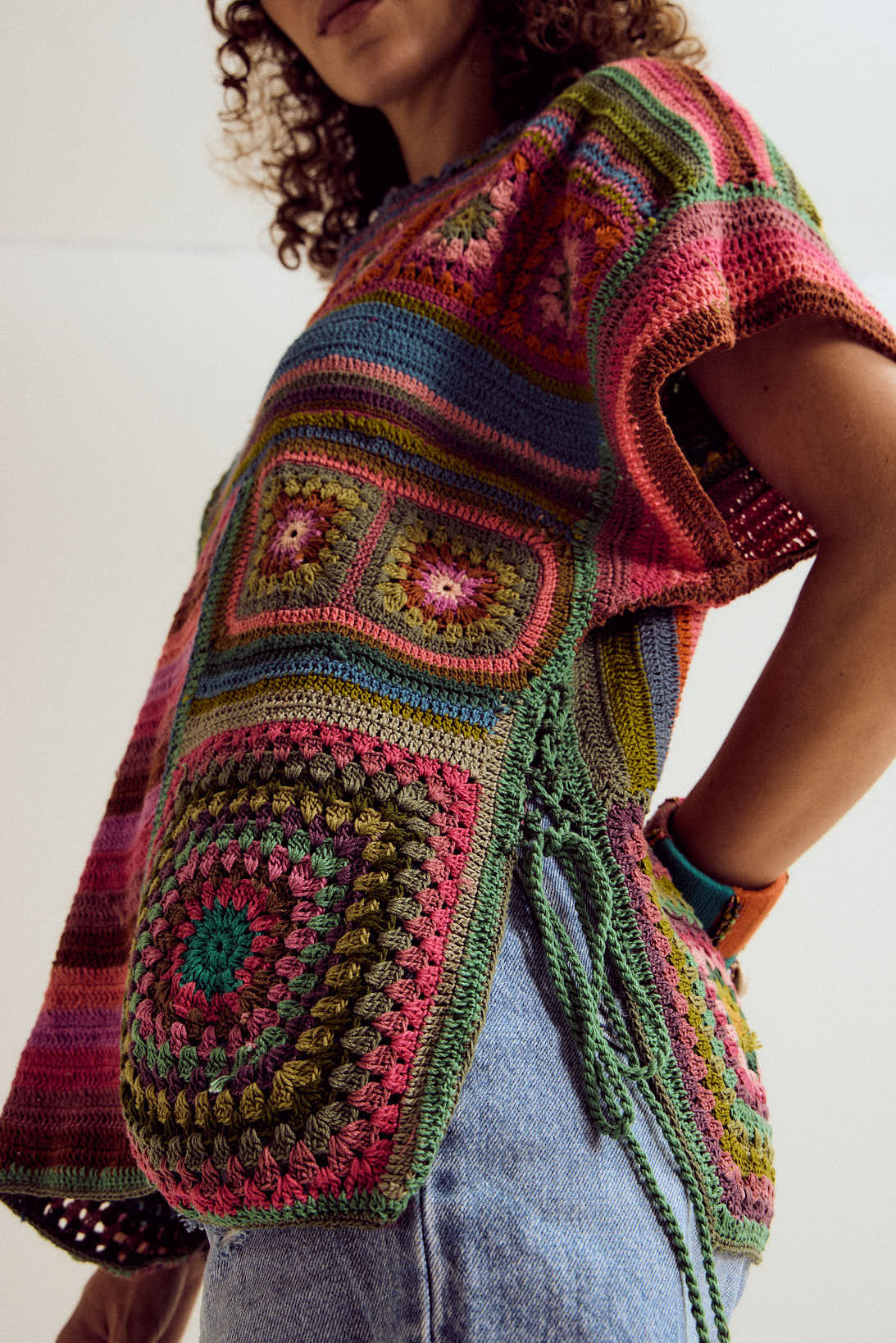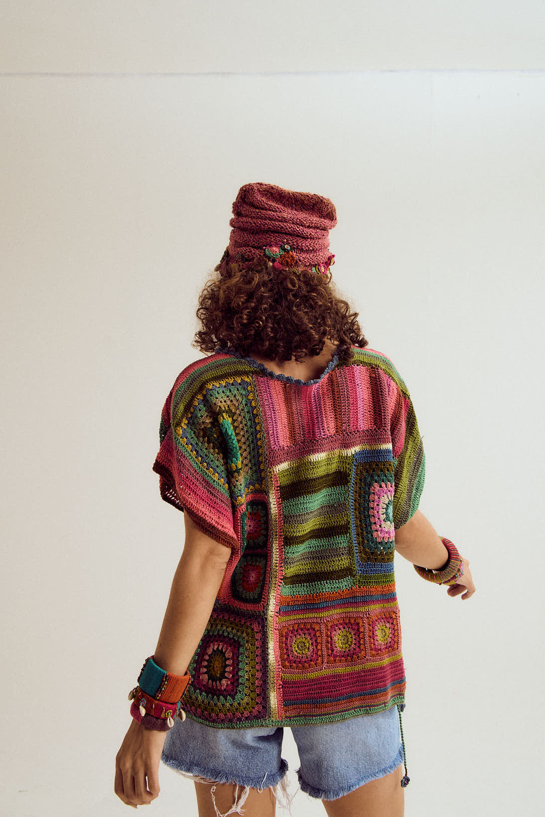 A contemporary multi-panel crochet top designed in a relaxed box fit, featuring artisanal patchwork detailing and soft tassel tie-ups along the sides. The kimono-inspired silhouette offers ease and movement, blending handcrafted texture with modern structure for an effortless look.